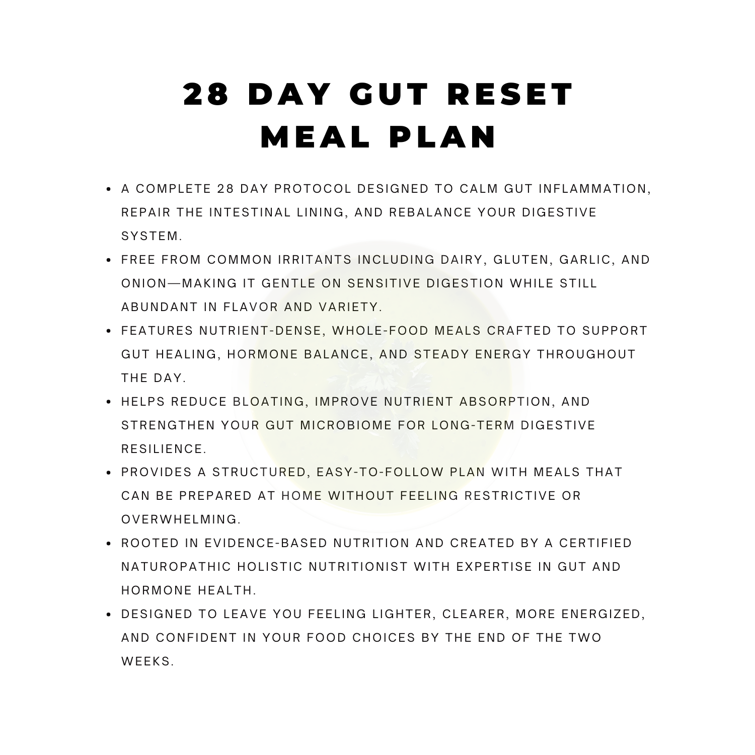 My 28-Day Gut Reset is a gentle, science-backed meal plan designed to calm inflammation, repair the gut lining, and rebalance digestion—completely free from dairy, gluten, garlic, and onion. With easy to follow substitutions and recommendations for alternatives to swap. Each day features nourishing, easy-to-follow meals built with whole foods that support gut health, hormone balance, and energy. This plan gives your digestive system a break from common irritants while still feeling abundant and satisfying, helping you reduce bloating, improve nutrient absorption, and feel lighter, clearer, and more energised in just two weeks.