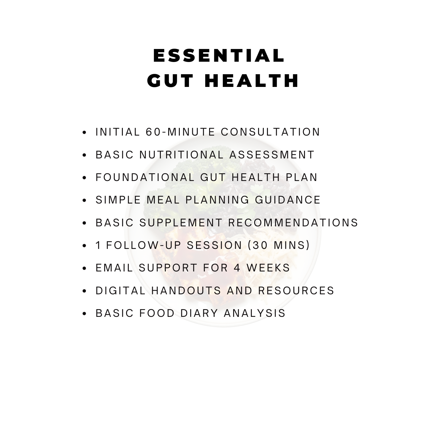 Start your journey to optimal gut health with our accessible Essential Gut Health Package, thoughtfully designed to give you a strong foundation for lasting digestive wellness. This comprehensive starter package includes an in-depth 60-minute initial consultation where we'll uncover your unique health challenges and goals, followed by a thorough nutritional assessment to identify key areas for improvement. You'll receive a customised gut health plan with clear, actionable steps, along with straightforward meal planning guidance that fits your lifestyle.